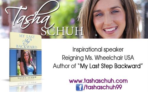 Come meet Tasha, inspirational speaker, reigning Ms. Wheelchair USA, and author of "My Last Step Backward". In this poignant memoir you'll discover Tasha's remarkable spirit, the confidence to welcome adversity into your own life, and the courage to face your own trap door of opportunity. Learn more about Tasha's story by visiting her website at www.tashaschuh.com and follow her inspiring journey on her Facebook page: www.facebook.com/tashaschuh99.